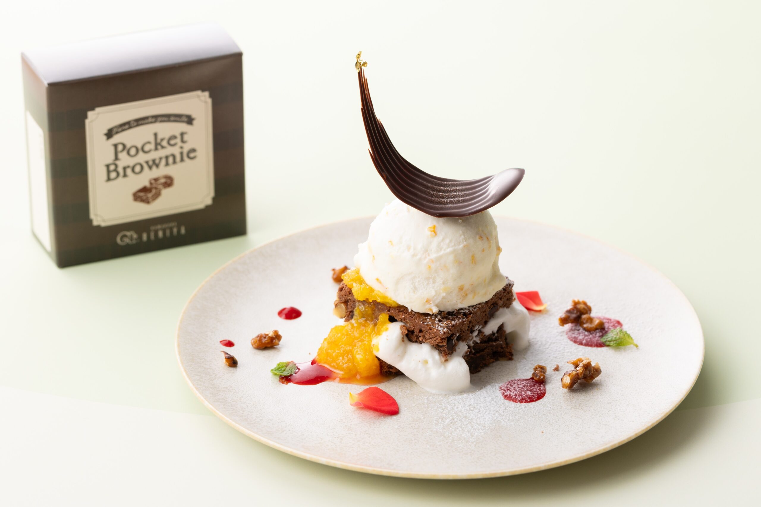 さわやかなヨーグルトクリームをサンドした「ポケットブラウニー」に、さっぱりとした伊予柑のアイスクリームをのせ、伊予柑のソースとチョコレートをトッピングしました。