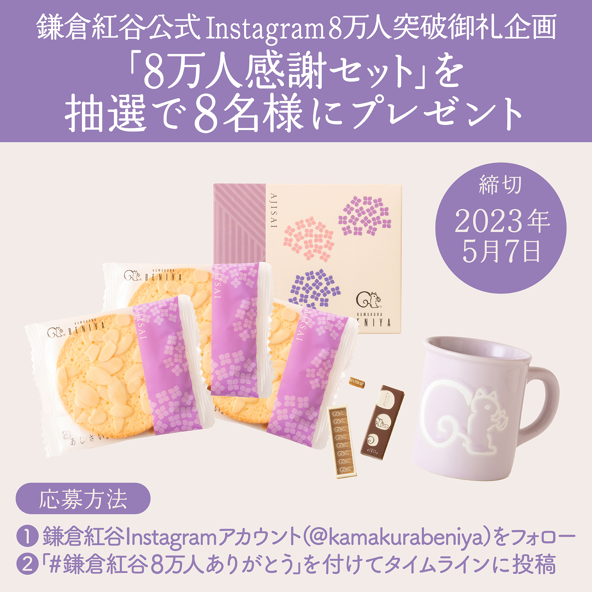2016年に開設した「鎌倉紅谷公式Instagram」ですが、おかげさまで今月フォロワー数8万人を突破いたしました。御礼企画といたしまして「8万人感謝セット」を抽選で8名様にプレゼントいたします。