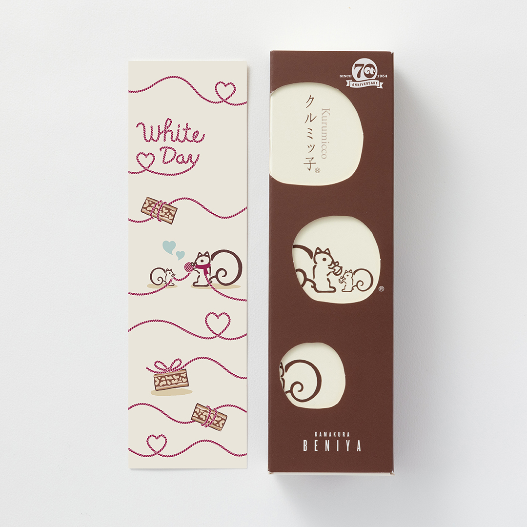 リスくんと子リスくんが仲良く巻いている毛糸が、クルミッ子に巻きついたりハート模様を織りなしたり…ホワイトデーにぴったりの心温まるデザインです。