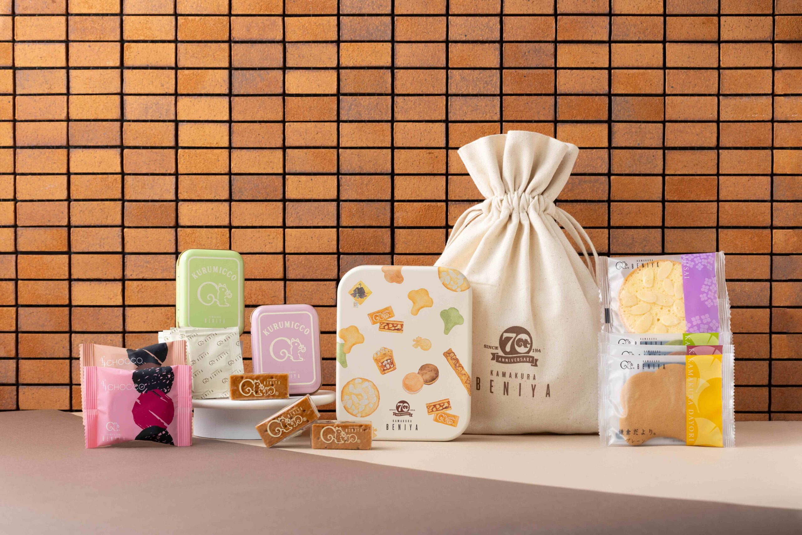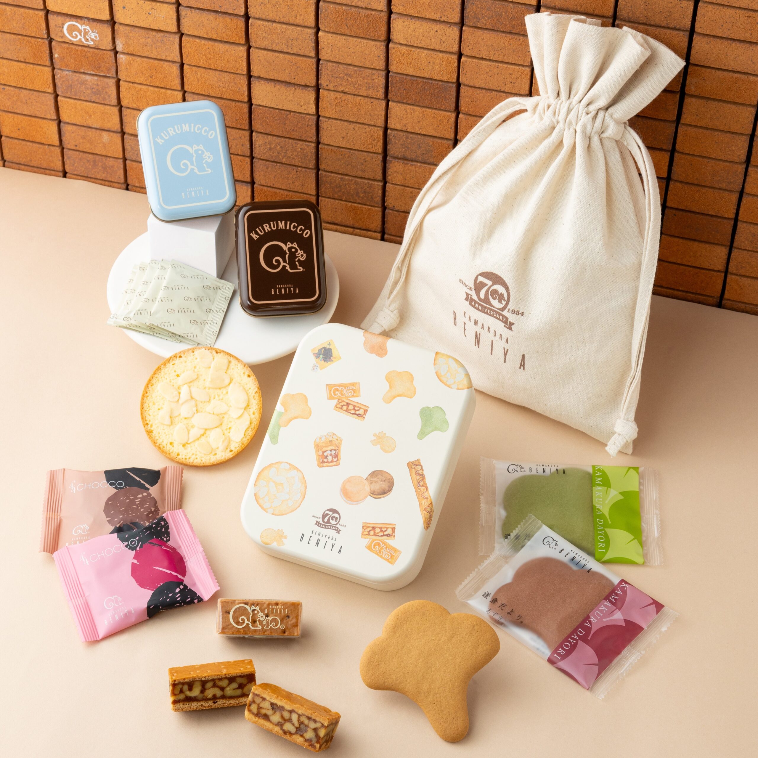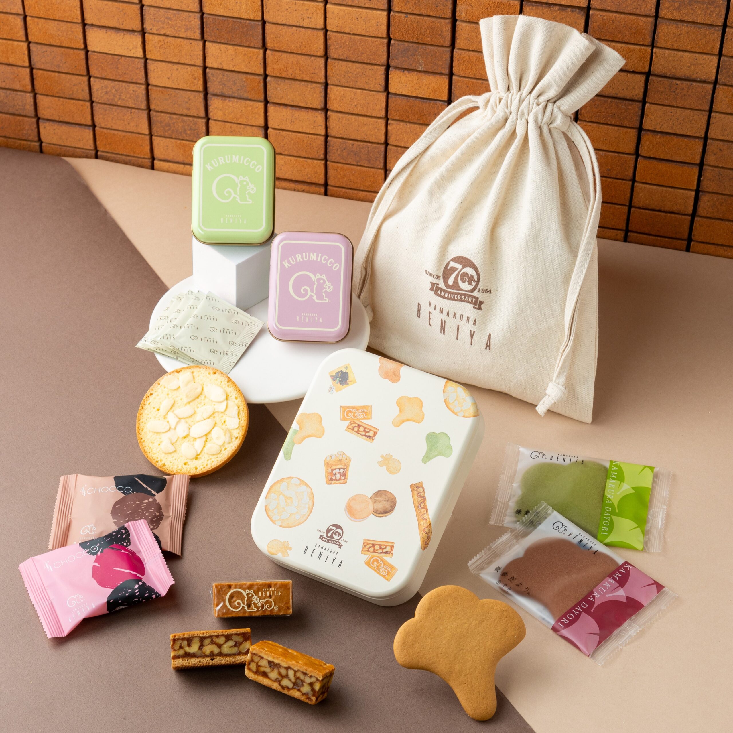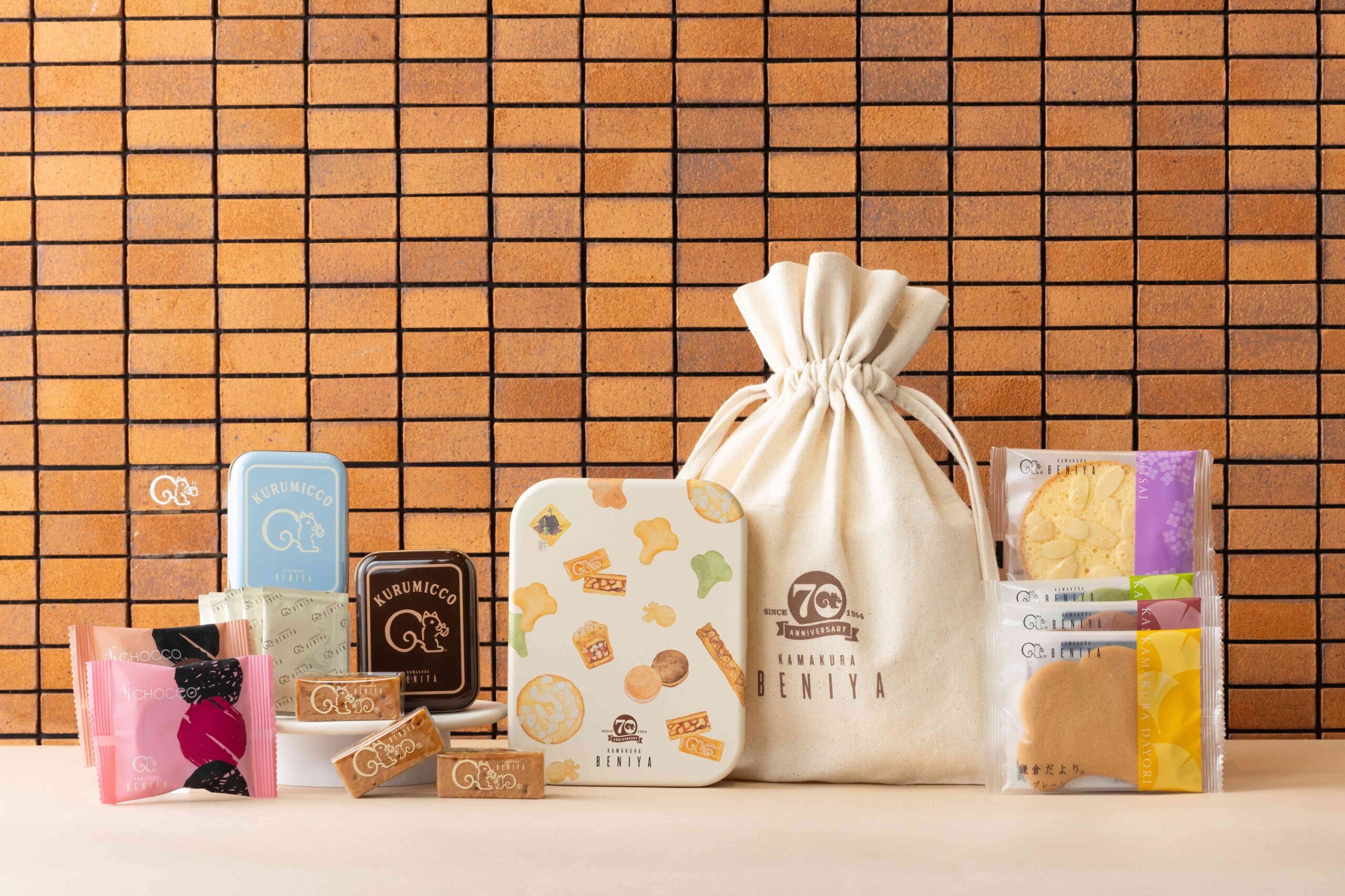 バラエティ豊かなお菓子が描かれた「70周年デザイン缶」と、鎌倉紅谷がこれまで販売してきたクルミッ子10個入(缶)の「ミニチュア缶」を、70周年ロゴマークがデザインされたコットンバッグに入れました。