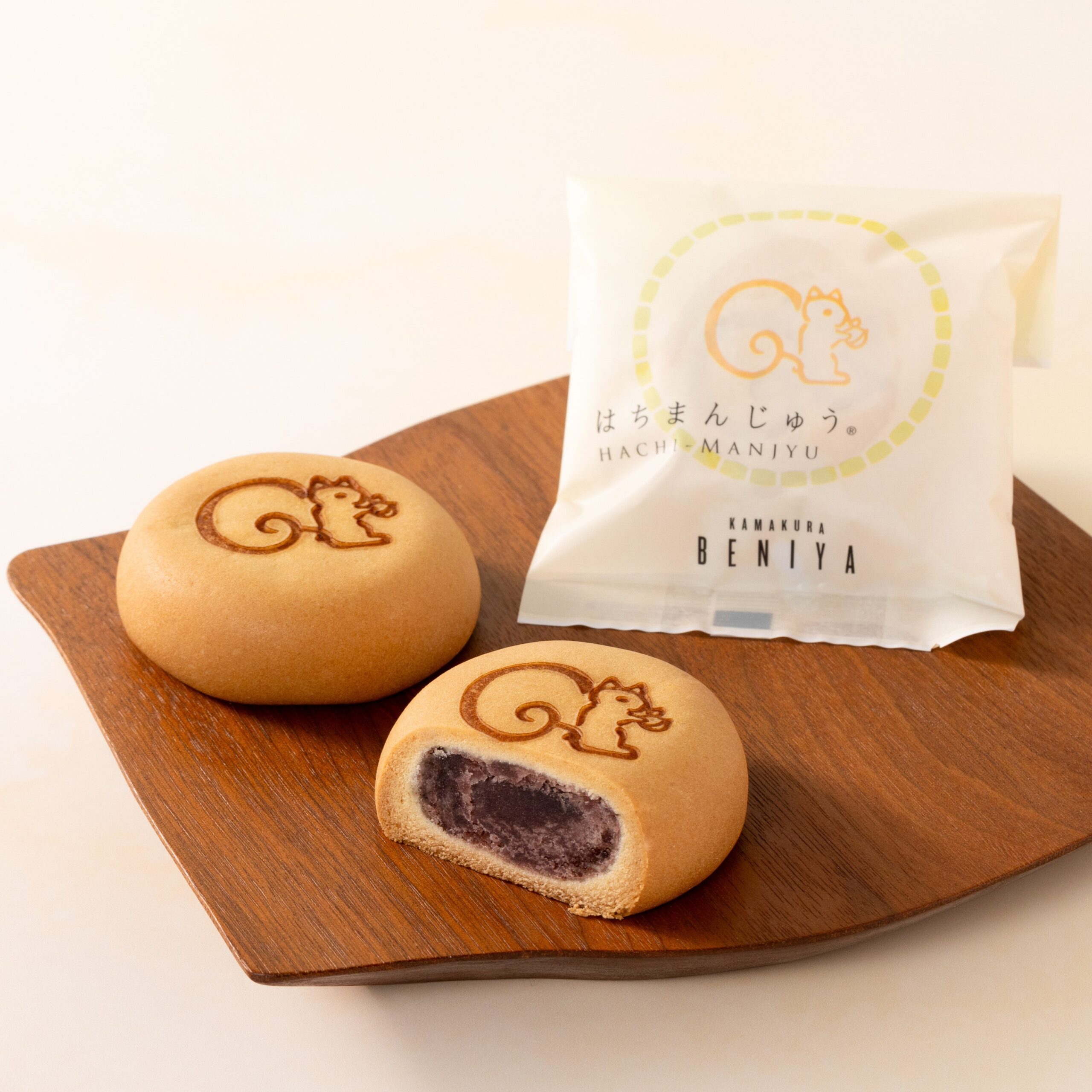 “クルミッ子”の生地をベースにしたバター香る生地で、北海道産小豆を100%使用したこし餡を包んだ「はちまんじゅう」は、和と洋の要素が融合した鎌倉紅谷ならではのおまんじゅうです。裏面のクルミがアクセントになっています。愛らしいリスくんの焼き印と、思わず心がほっこりしてしまう優しい甘さをお楽しみください。
