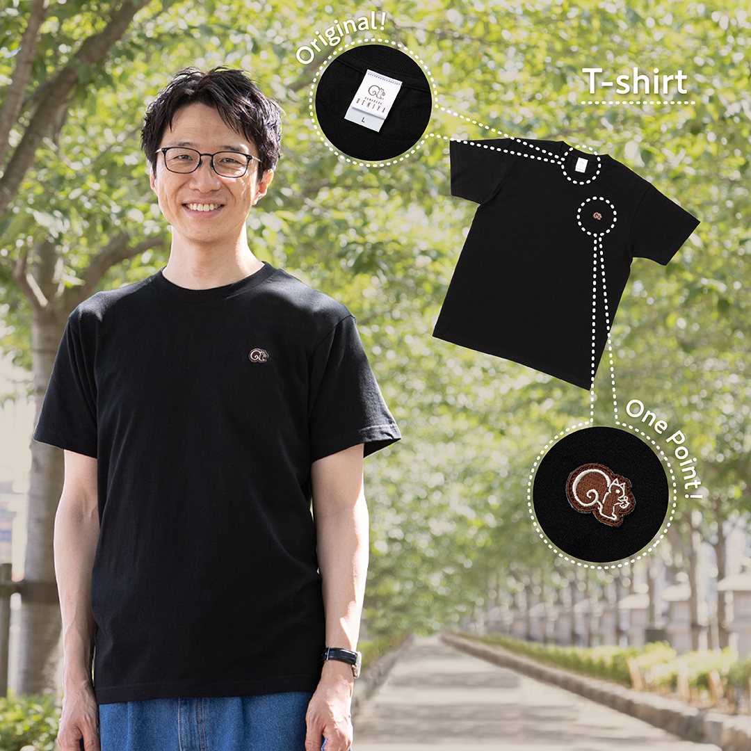 満を持しての初登場となるTシャツは、「リスくん」のロゴ刺繍ワッペンが黒ベースにさりげなく映えるシンプルな仕上がりです。