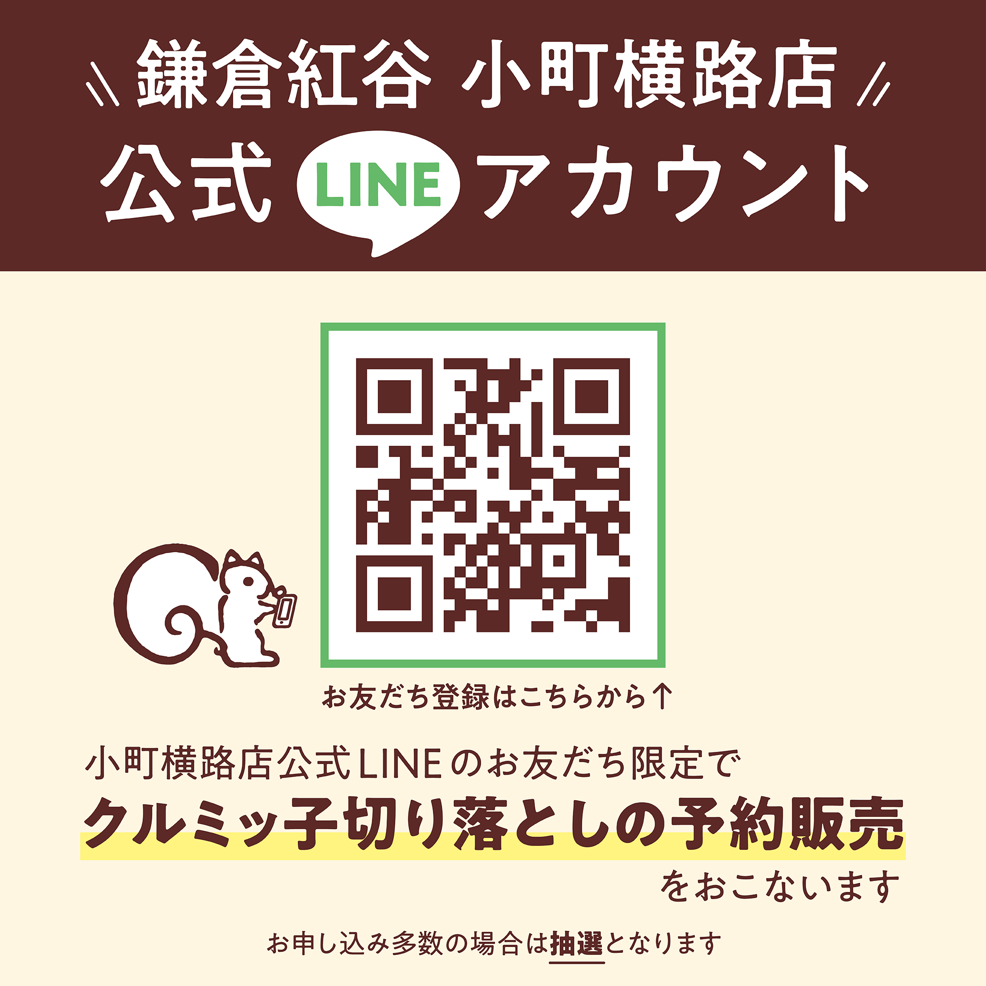 小町横路店 公式LINEアカウントを通じた「クルミッ子切り落とし」のご予約(お申込み多数の場合は抽選)販売を開始いたします。