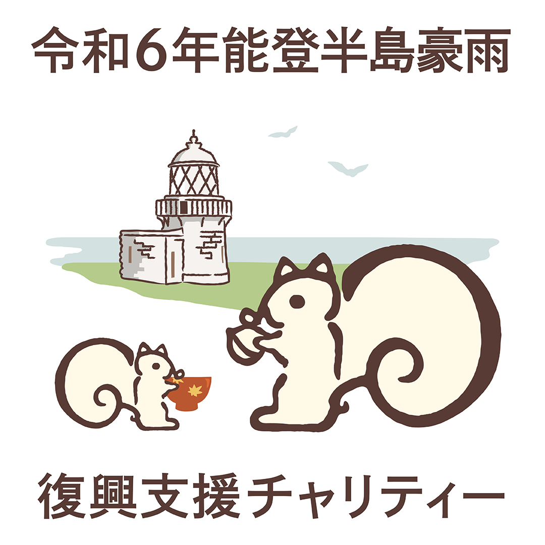 今回のデザインは、能登半島の最先端「禄剛埼灯台」の前に立ち、一日でも早く能登半島の復興が進むことを願い、思いを寄せるリスくんのイラストとなっております。リスくんとともに、思いを寄せていただけますと幸いです。