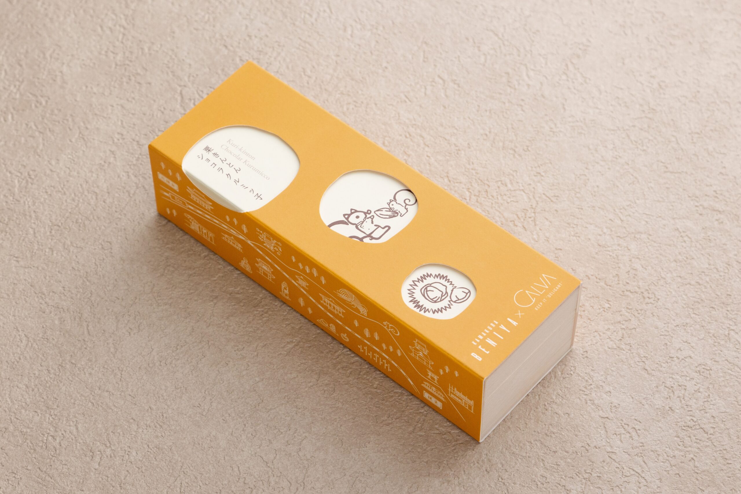 スリーブ表面には、コックコートを着たシンボルキャラクターの“リスくん“が、子リスくんからカカオポッドを渡される様子を、右側面にはカカオポッドを受け取る様子をデザインし、これからお菓子作りを始めるようなストーリーを演出しています。また、左側面には八幡宮前本店からショコラトリーカルヴァ北鎌倉門前までの道のりを鎌倉の絵地図と共に描き、2社を繋ぐ鎌倉の地を表現いたしました。