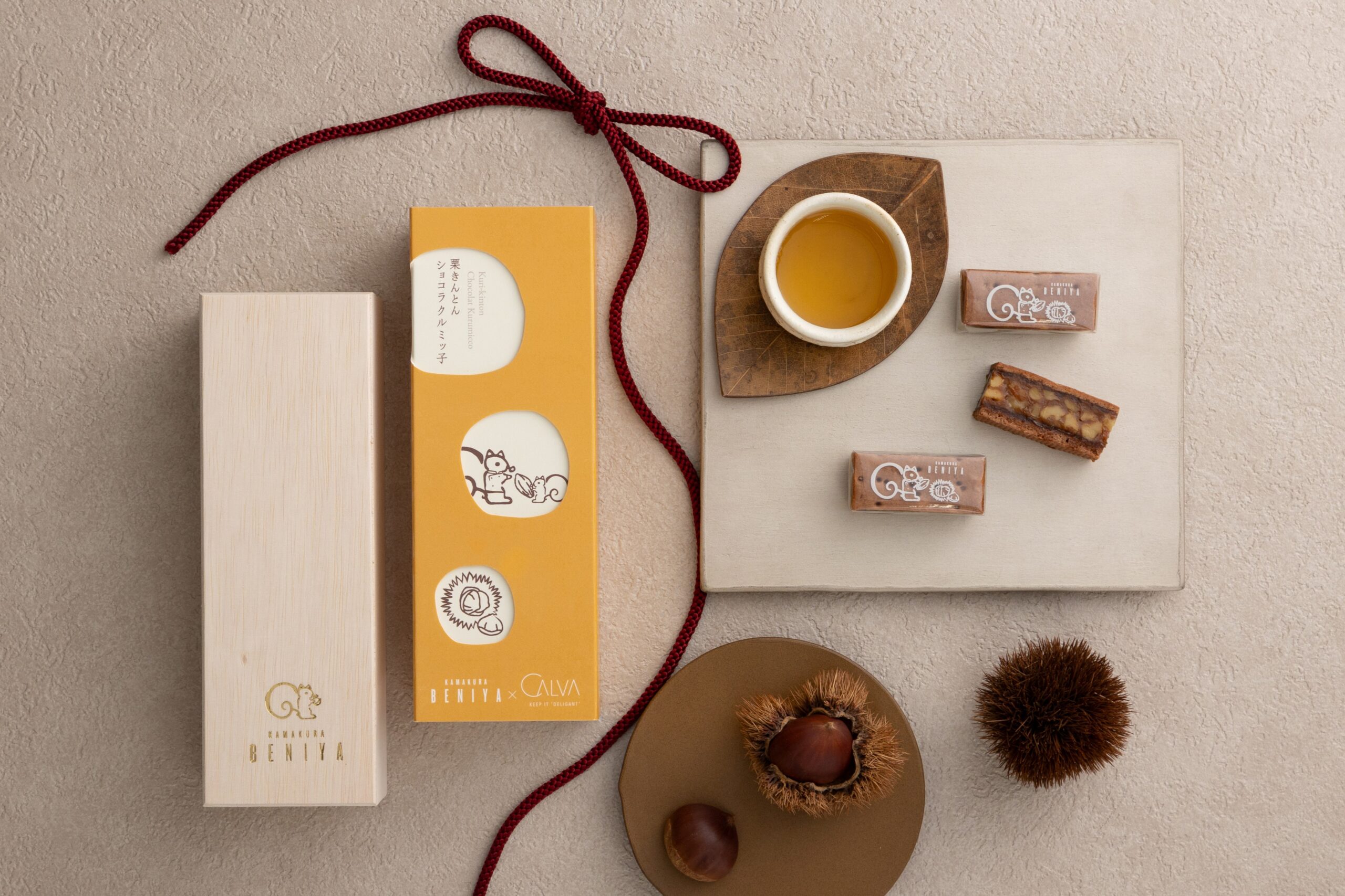 “鎌倉”を愛する2社が協力して開発したコラボレーション商品は、CALVAの看板商品「栗きんとんショコラ」と同様に木箱に入れ、オリジナルデザインのスリーブを付けてご用意いたします。