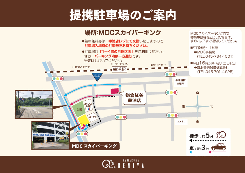 ご不便をおかけいたしますが、お車でご来店の際には提携駐車場「mdcスカイパーキング」の「1~4階の月極区画」をご利用くださいませ。