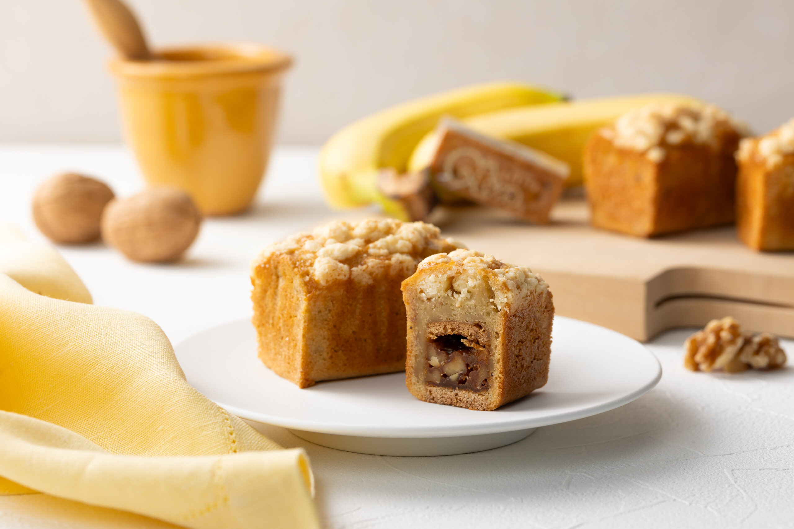 バナナの濃厚な風味とクルミッ子のキャラメル、クルミが合わさり、新しいおいしさを引き出しました。