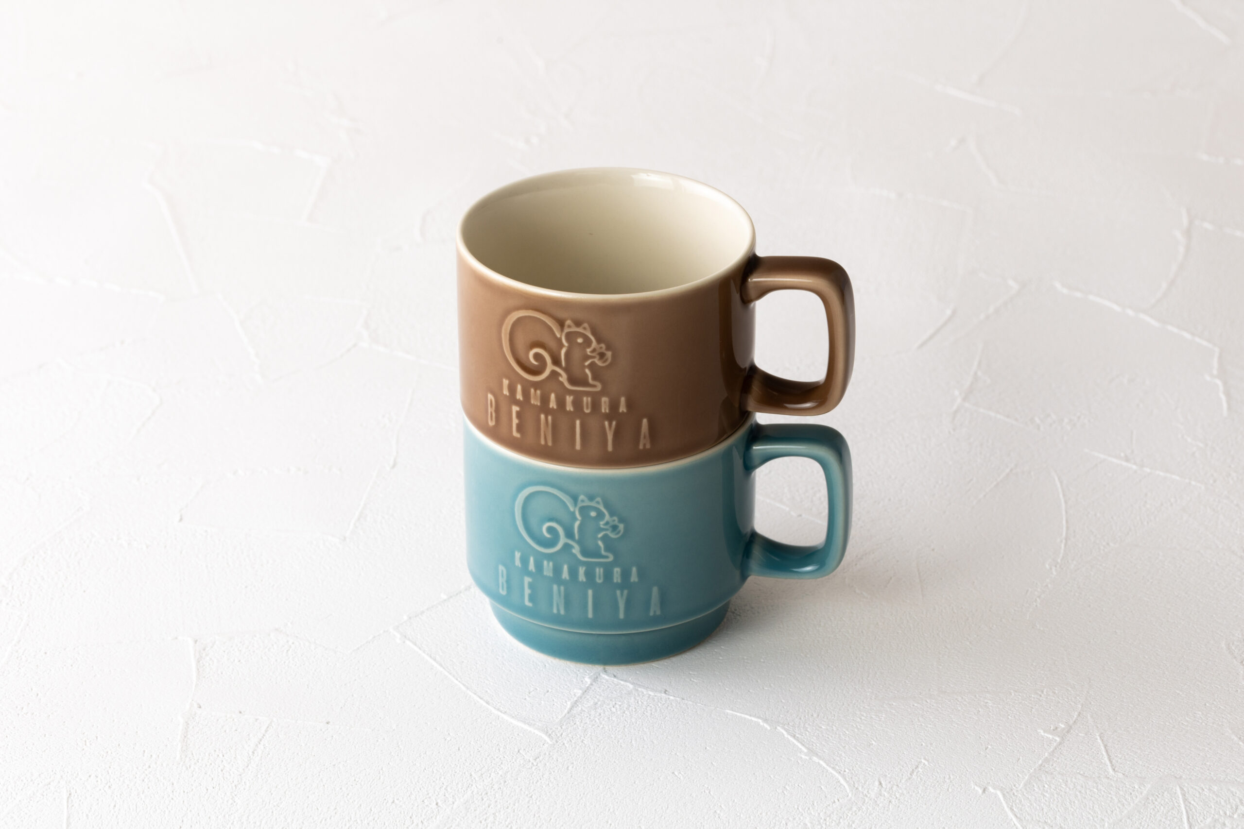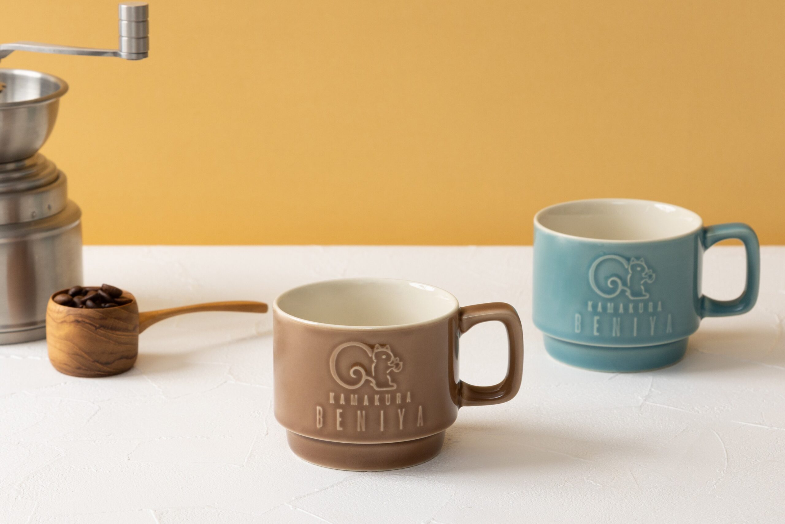 表面に鎌倉紅谷のロゴマークが立体加工で施されたユニークなデザインで、複数のマグカップをスタッキングして収納いただけます。