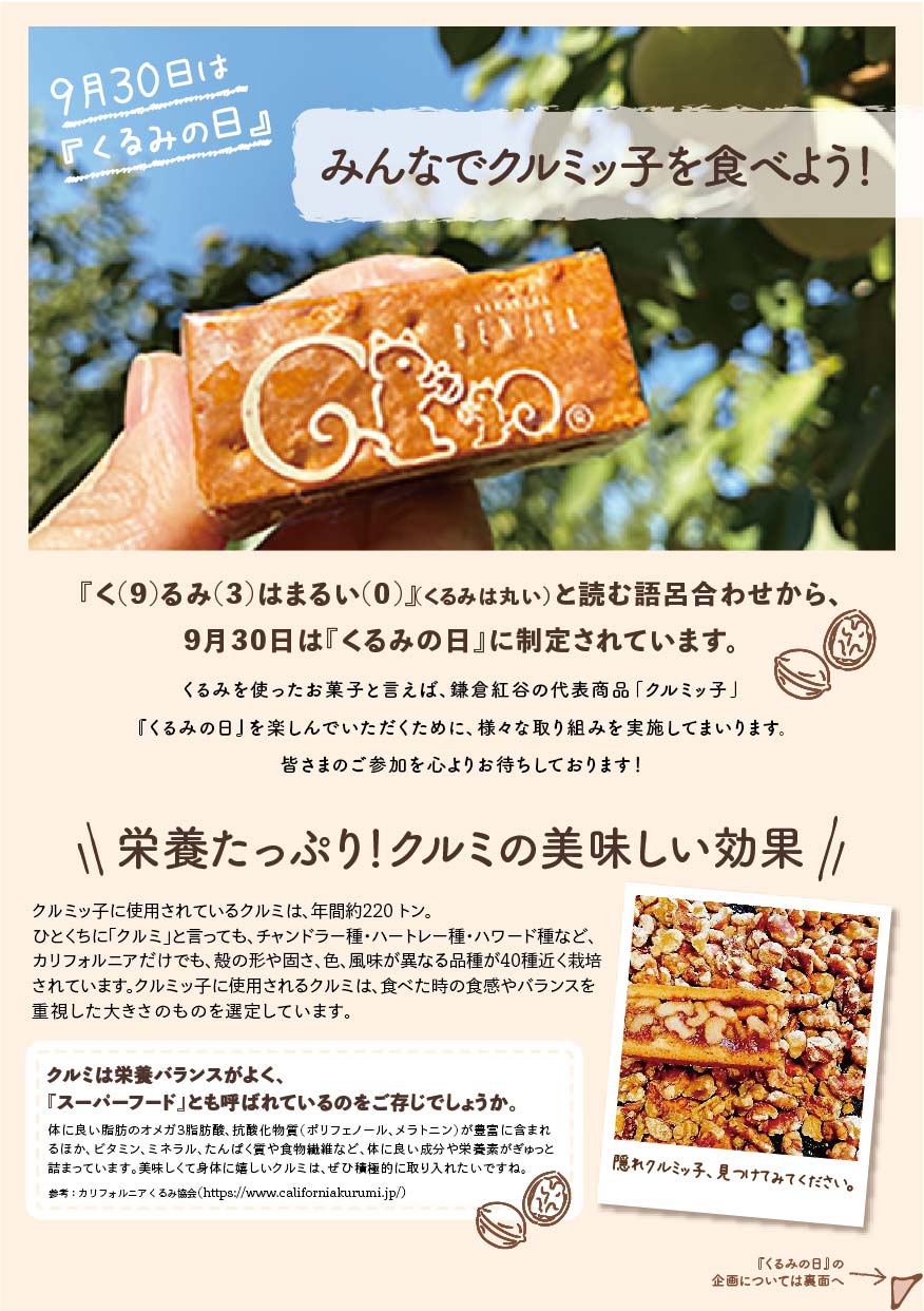 日頃より鎌倉紅谷をご愛顧いただき、誠にありがとうございます。 9月30日は「く(9)るみ(3)はまるい(0)」と読む語呂合わせから くるみの日に制定されています。 クルミと言えば、クルミをたっぷり使用したクルミッ子、ということで 9月30日までの期間、様々な企画を実施してまいります。 店頭、オンラインショップ、SNSでお楽しみいただける企画をご用意しておりますので ぜひ、皆様のご参加をお待ちしております。