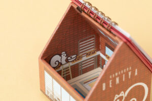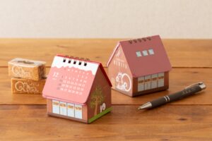 クルミッ子が作られていく様子を忠実に再現したイラストが描かれた、ハウス型のカレンダーです。