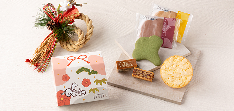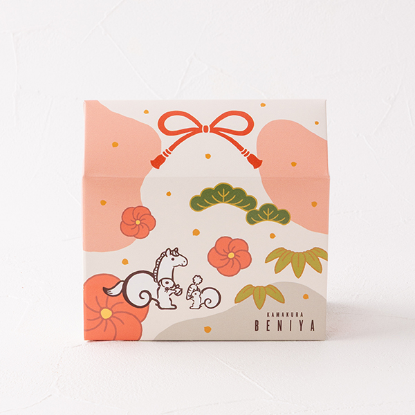 新たな年の始まりに、願いを込めた「お守り」をイメージしたハウス型BOXです。正面には松竹梅を、全体には黄金色のクルミをちりばめ、背景にはめでたいことの前兆とされる和柄〈慶雲〉をモダンにアレンジし、華やかで優しい印象に仕上げました。2026年の干支にちなんだ“うまリスくん”にもご注目ください。