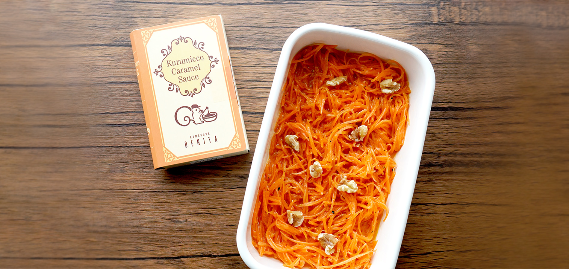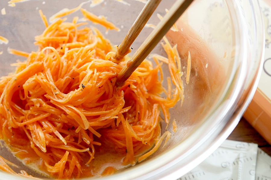 材料(作りやすい分量) クルミッ子キャラメルソース (2袋だとさっぱりとした仕上がりに、3袋だと甘めの仕上がりになります) 2~3袋 人参 1本 酢 大さじ2 オリーブオイル 大さじ1 塩 適量 黒こしょう 適量 くるみ 適量