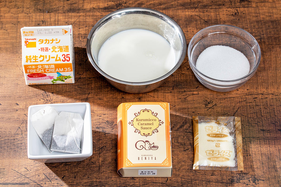 沸いたら火を止め、①のゼラチン、グラニュー糖、キャラメルソース2袋を加え、ヘラで混ぜて溶かします。溶けたら生クリームを加えます。