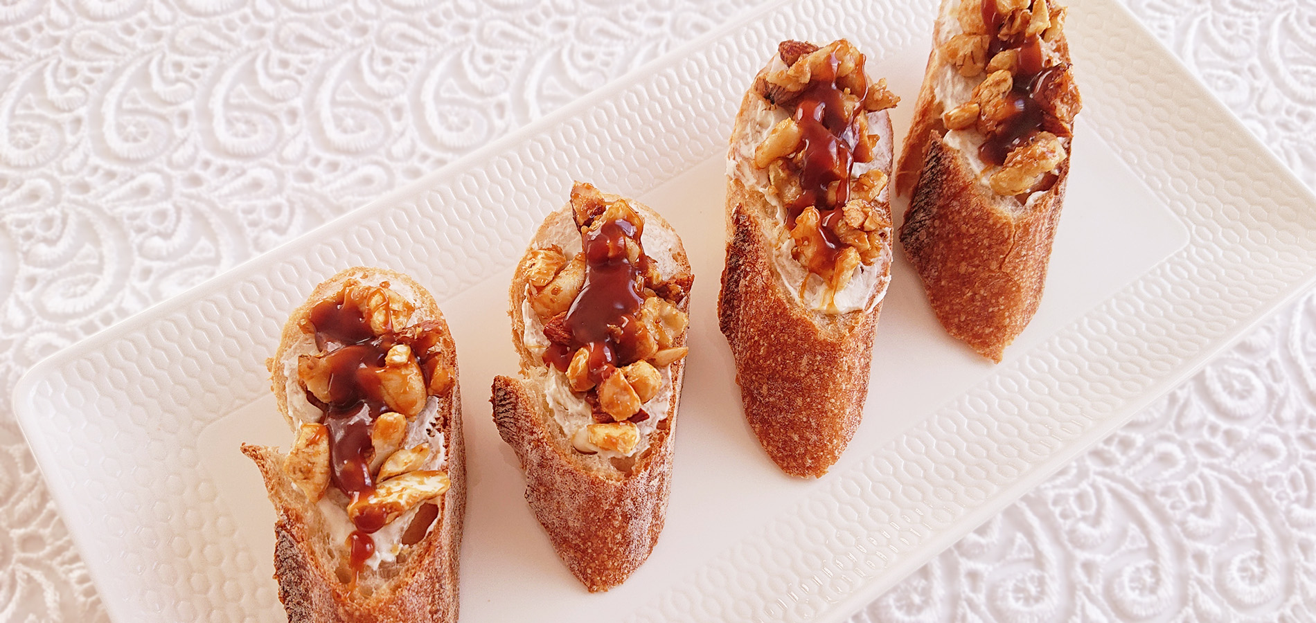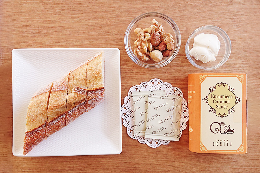 キャラメルソースが絡んだザクザクのナッツと、クリームチーズがマッチしたお手軽オープンサンドです。