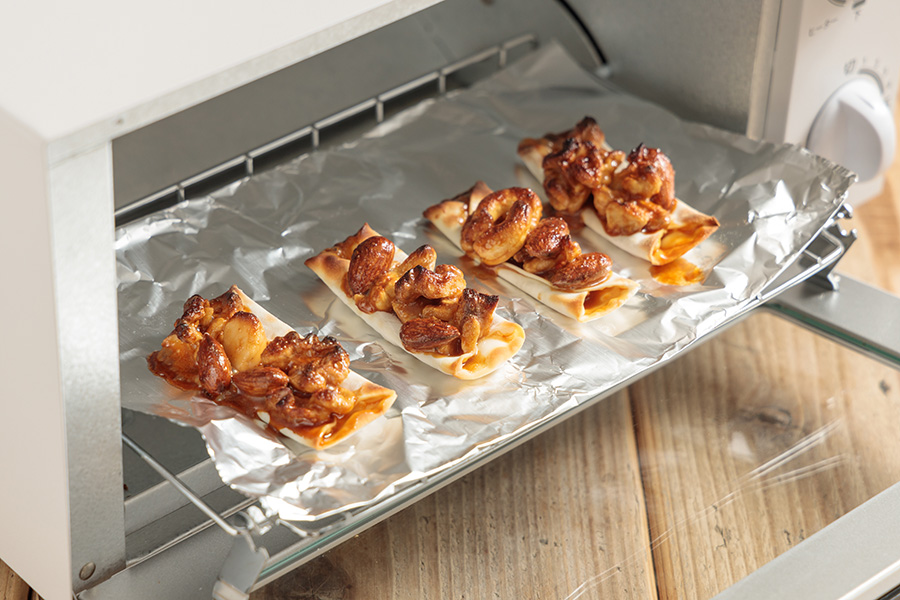 オーブントースターで3~4分程度焼きます。 ※ご家庭のものに合わせて調整してください