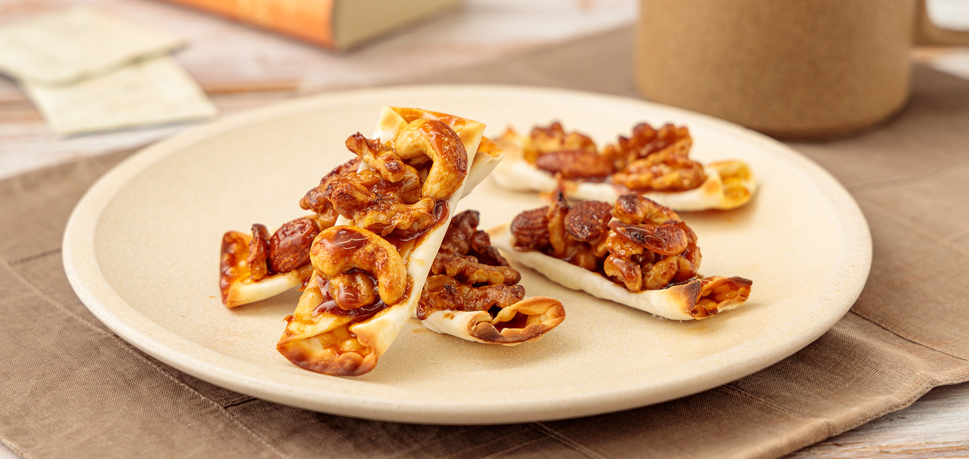 くるみとミックスナッツを粗めに砕き、キャラメルソース4袋と合わせます。