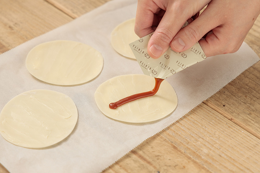②の真ん中に、縦にキャラメルソースを絞ります。(8枚で2袋使用)