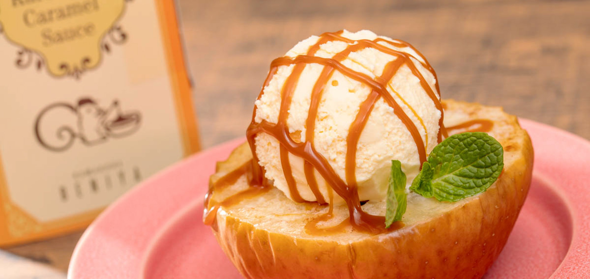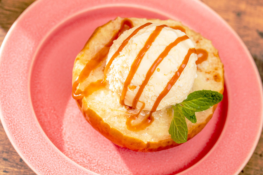 仕上げにバニラアイスクリームをのせてキャラメルソースを1袋ずつかけます。