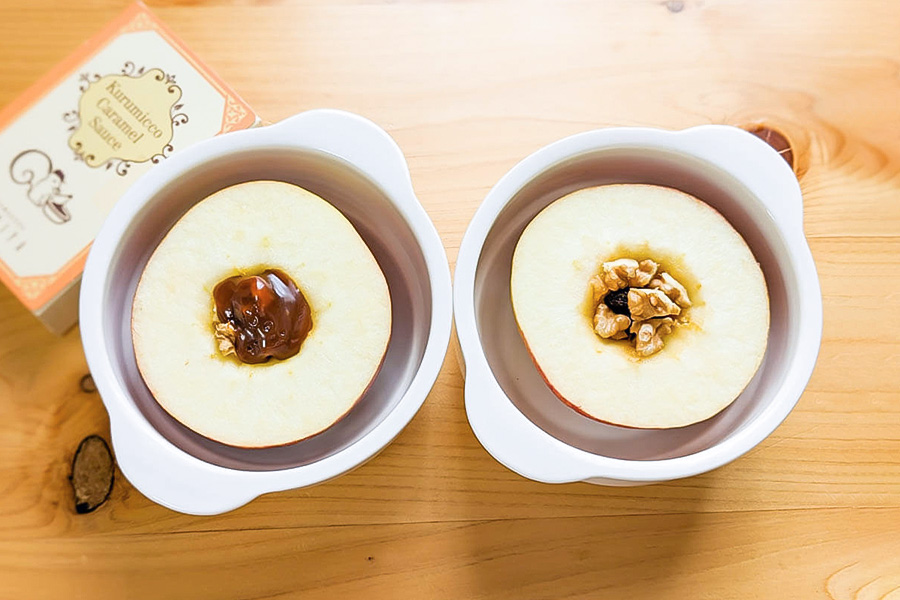 レーズン5粒、粗く砕いたローストしたくるみ1個、キャラメルソース1袋を①で芯を取り除いた箇所に詰めます。もう半分のりんごも同様に行います。