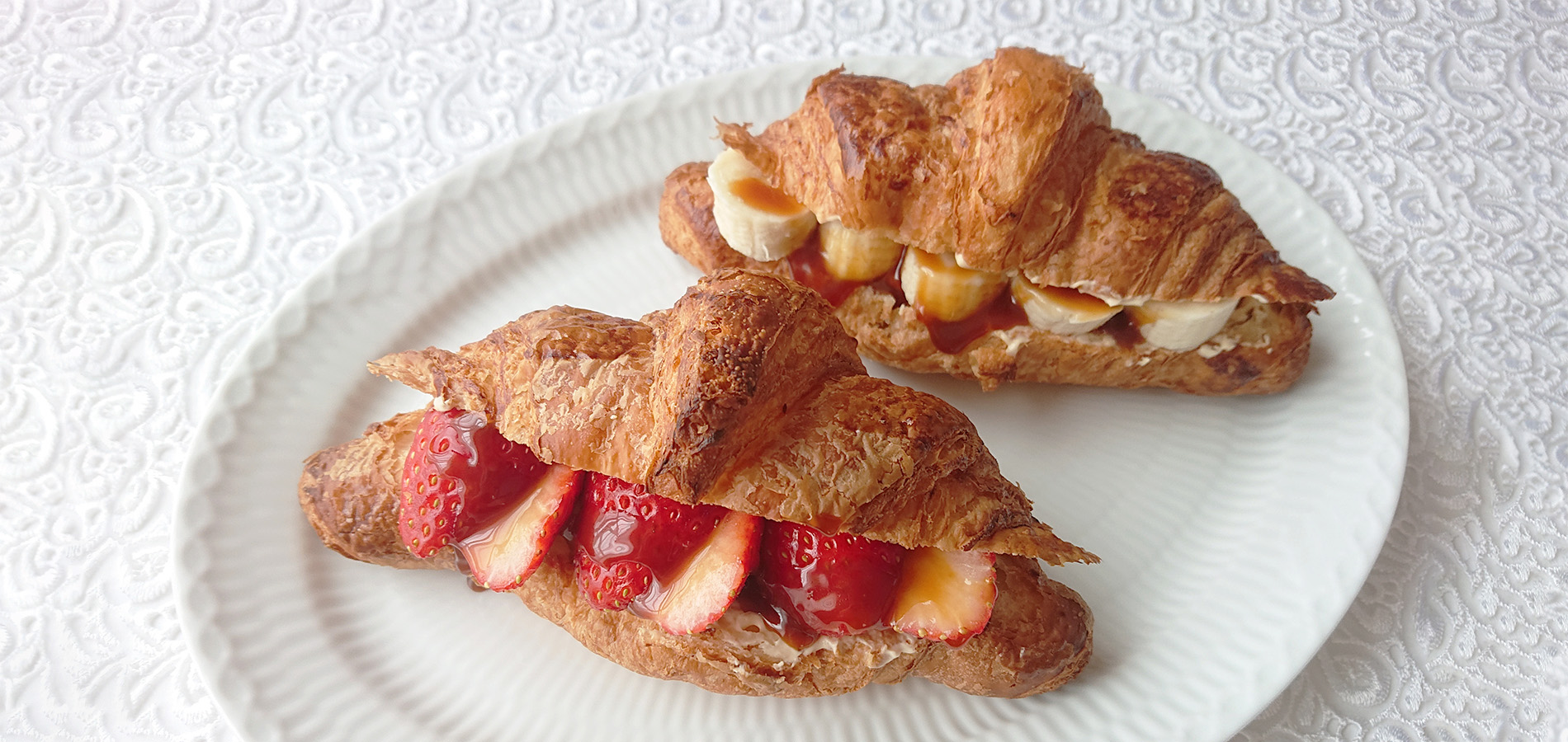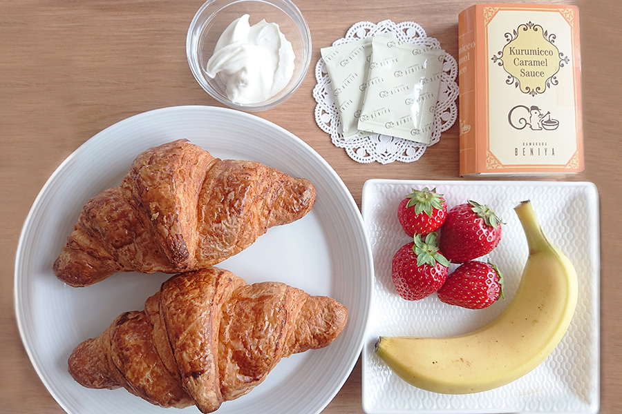 クロワッサンの横から切れ目を入れ、②を塗り①を挟みます。