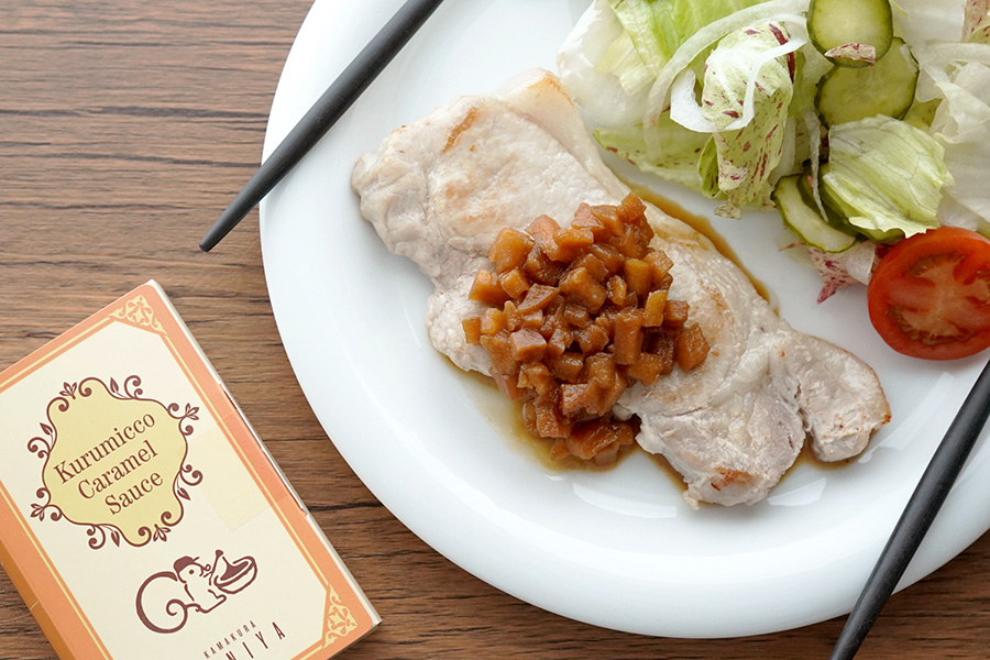 レモン汁、酒、醤油、キャラメルソースを加えて混ぜ、とろみがついたら火を止め、②にかけます。