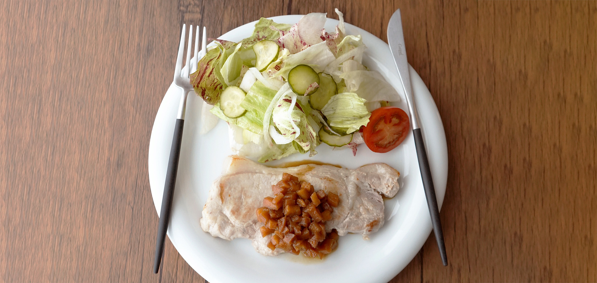 豚肉を常温に戻し、スジ切りをして両面に塩、こしょうをふります。りんごは皮をむき1cmの角切りにします。