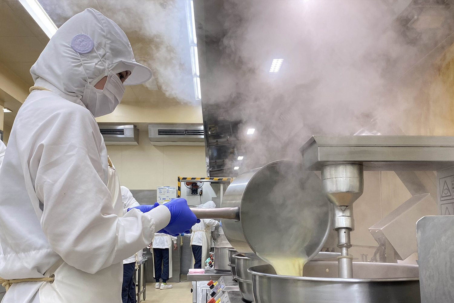 お鍋を洗ったり、材料を計量したりといったサポート業務からスタートし、まずは上生地を伸ばす作業を覚えていきます。その後はキャラメル伸し、キャラメルづくり、牛乳塗りの作業を習得しました。今年に入ってからは、仕込みの作業も覚えました。